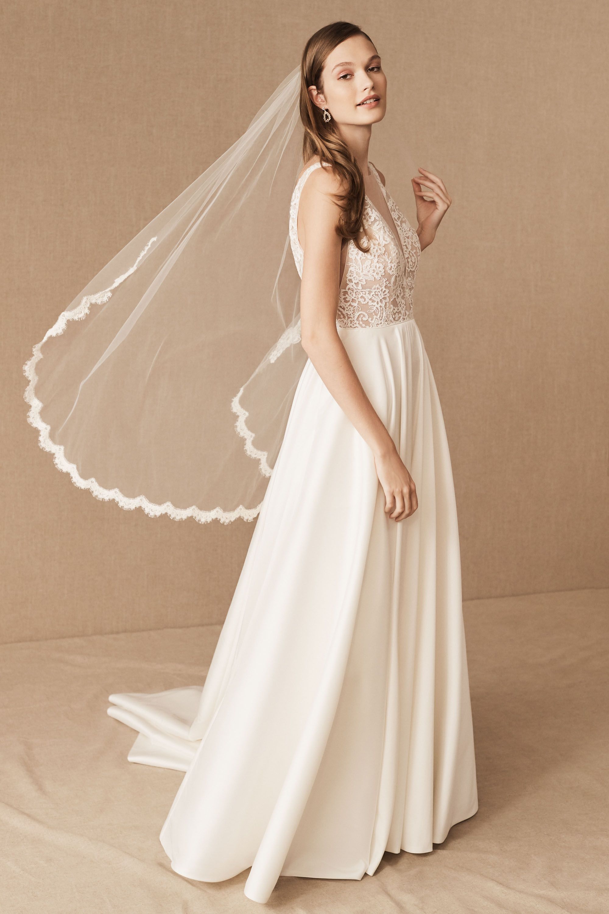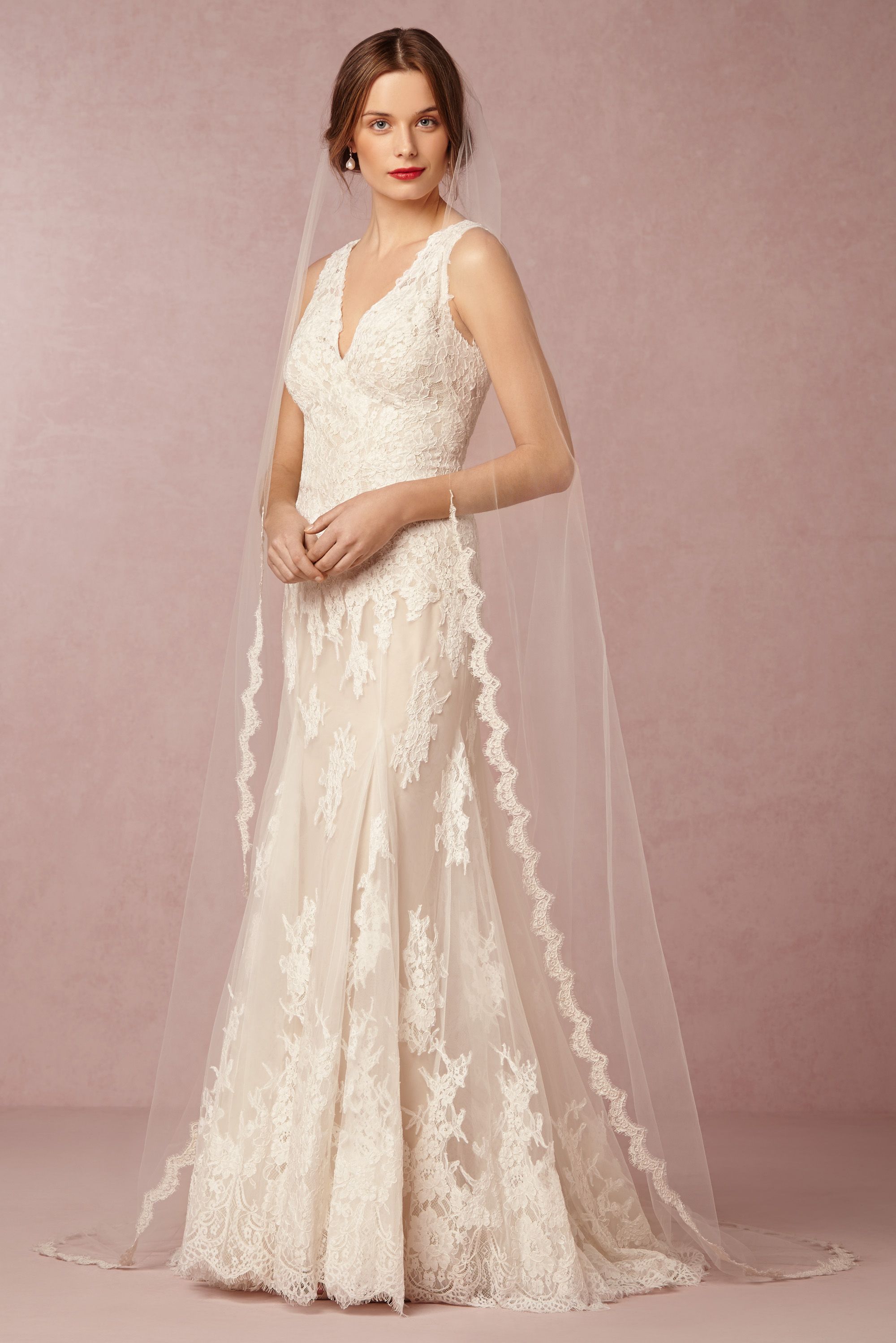 (El dibujo y las fotos son todas de la página de BHLDN, excepto el velo catedral via hellomagazine.com y el velo flyaway/de hombro via style me pretty)